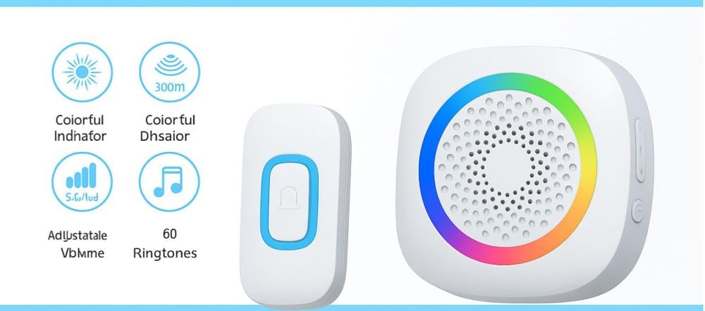 جرس باب لاسلكي يعمل بالبطارية، يتميز بمؤشر ضوئي ملون، مدى تشغيل حتى 300 متر، 60 نغمة مختلفة، مستوى صوت قابل للتعديل حتى 5 درجات .
